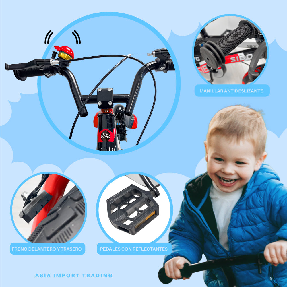 La bicicleta SIBOG cuenta con un marco resistente y liviano, frenos delantero y trasero que garantizan una conducción segura, y ruedas de apoyo desmontables para brindar estabilidad mientras aprenden a pedalear. El asiento acolchado y ajustable permite adaptarse al crecimiento del niño, y el manillar con textura antideslizante mejora el control y la seguridad durante el uso.