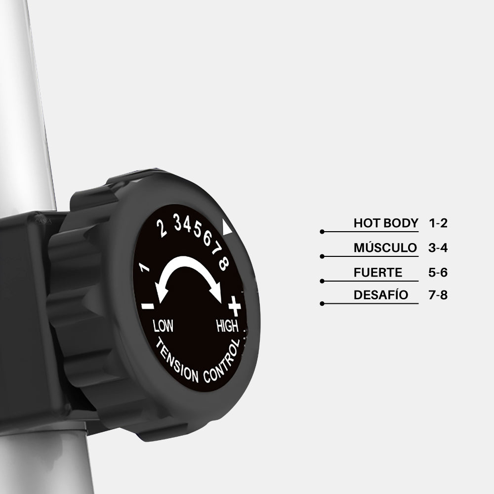 Tiene una resistencia manual con 8 niveles diferentes de intensidad. La altura del asiento es ajustable, panel con soporte para tablet o Ipad, altura de la bicicleta se puede ajustar con 3 marchas.