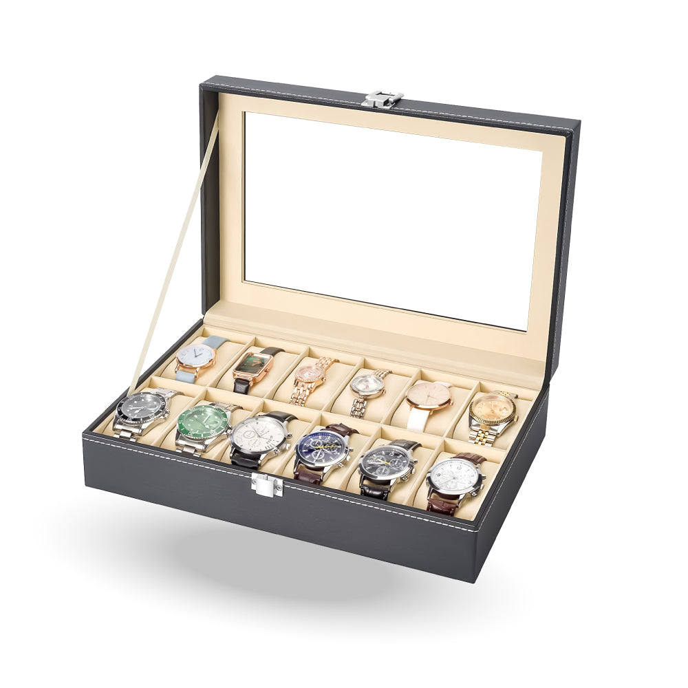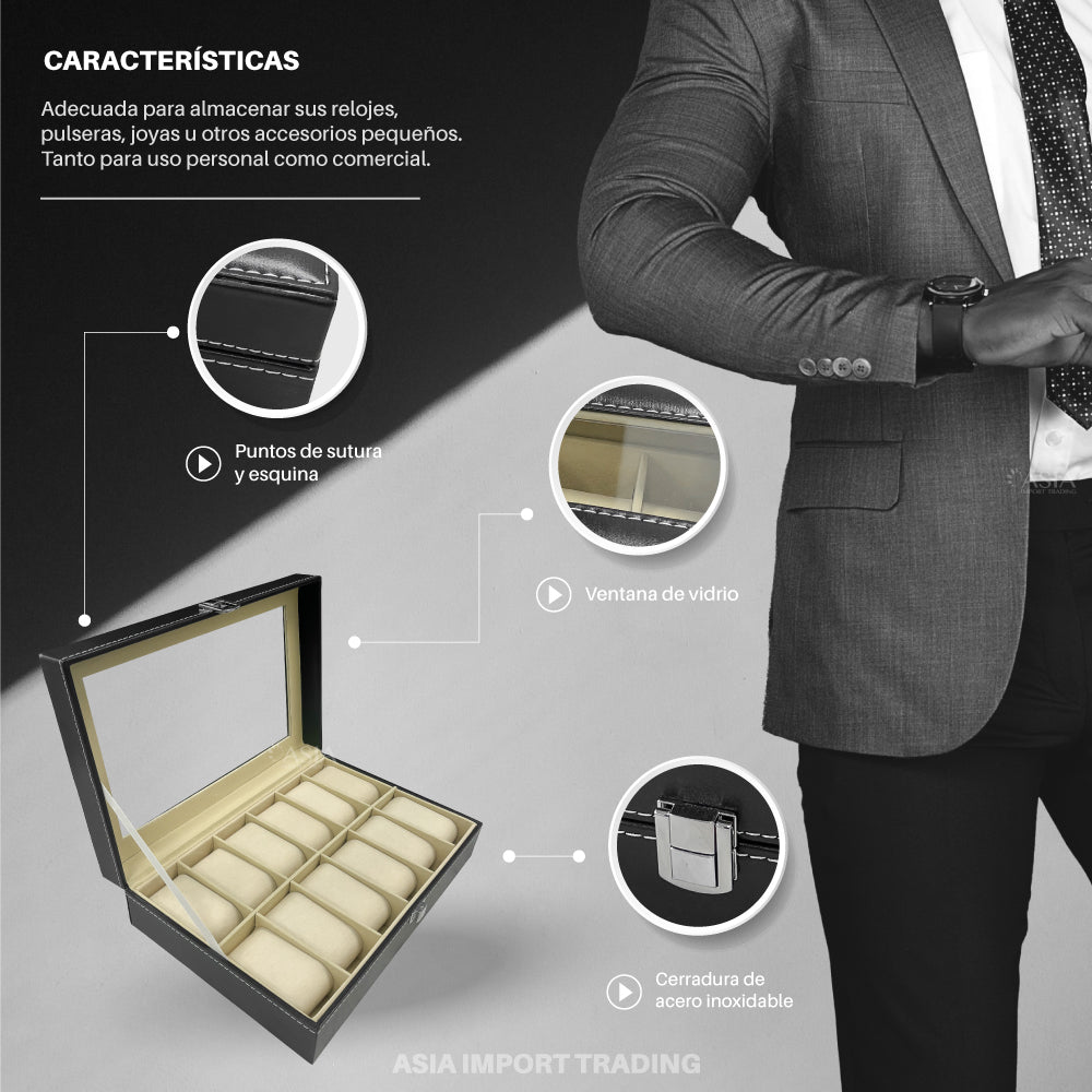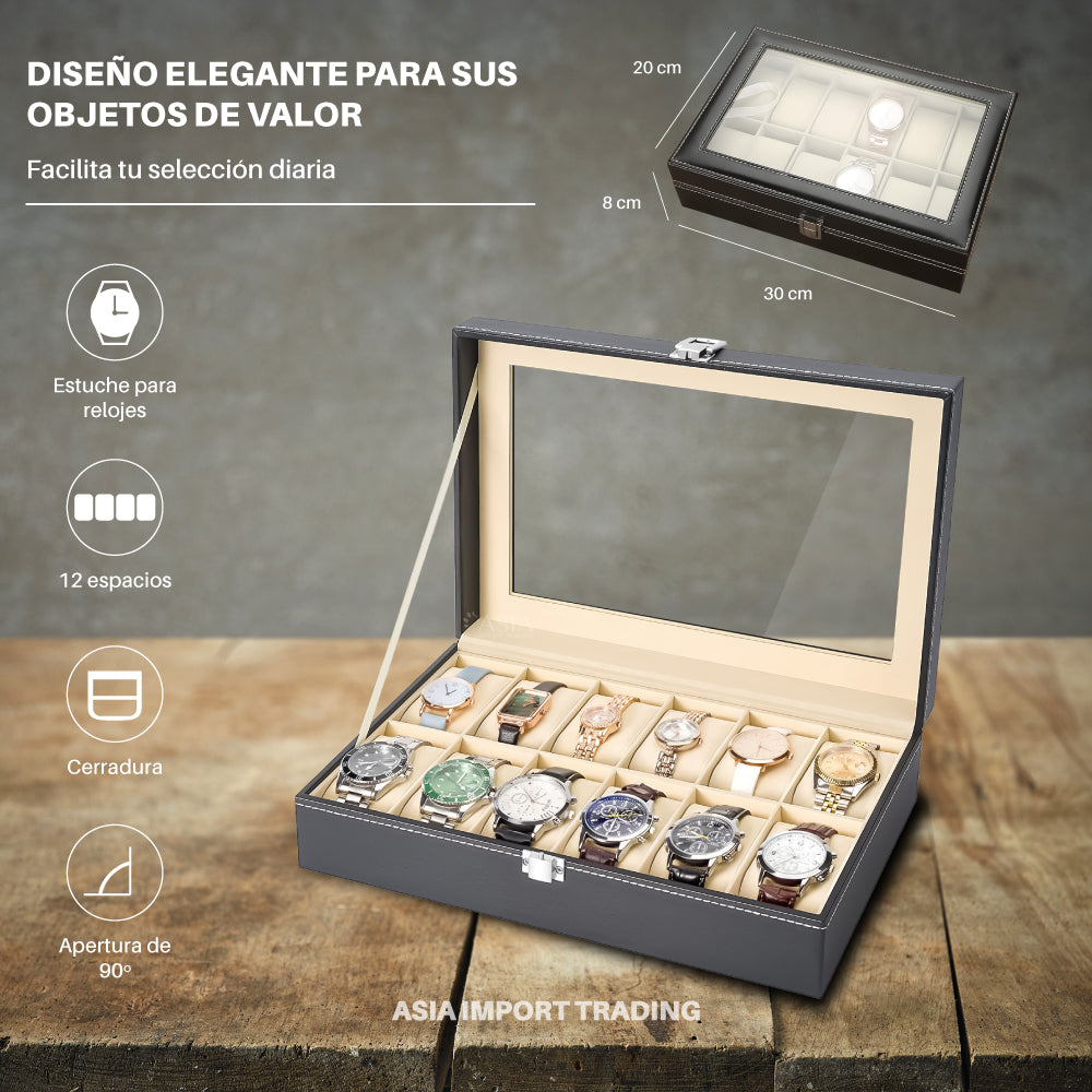 Organiza y protege tus relojes con estilo. Este elegante estuche cuenta con capacidad para 12 relojes, cada uno con su propio espacio acolchado, ideal para mantenerlos ordenados y sin rayaduras. Su tapa de vidrio transparente permite visualizar fácilmente tu colección, mientras que su cerradura añade un nivel extra de seguridad.