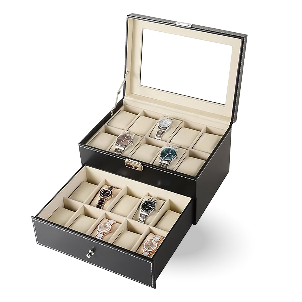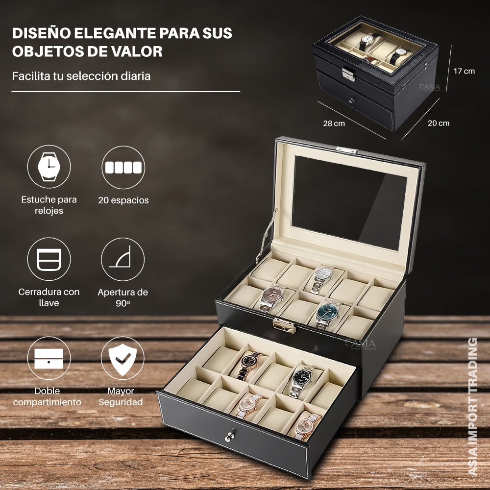 Esta practica caja organizadora te permite mantener ordenados y seguros tus relojes, cuenta con 2 niveles de 10 espacios cada nivel.