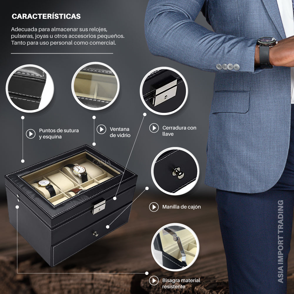 Es ideal para negocios de relojeria o para los fanáticos de los relojes, para guardar y mantener libres de polvo y humedad, con almohadillas removibles para darles mas espacio de ser necesario