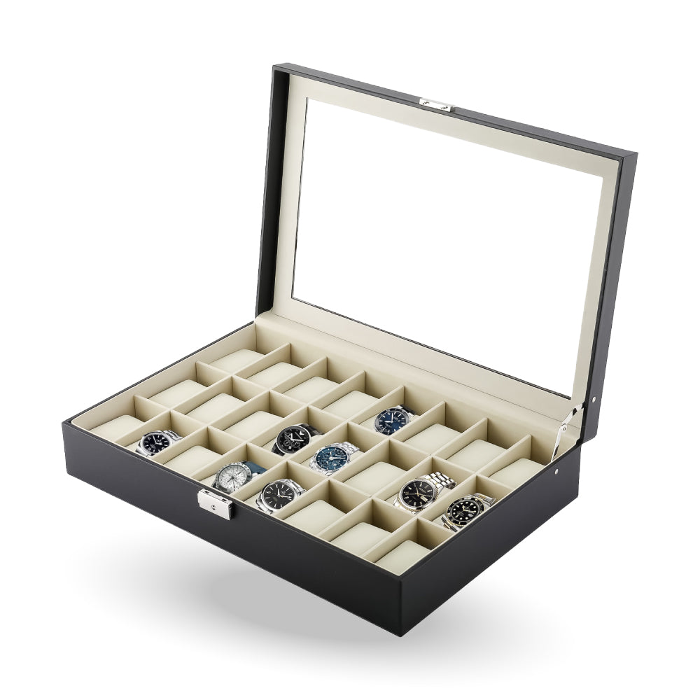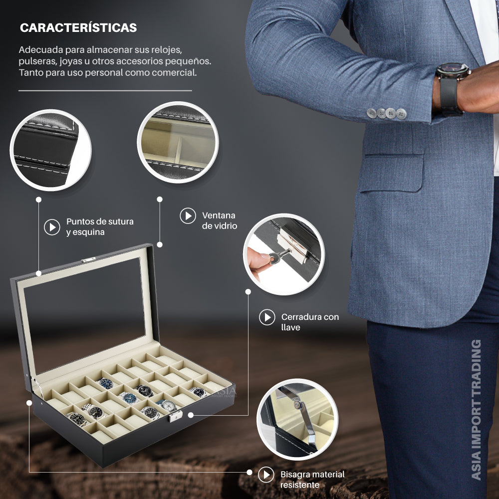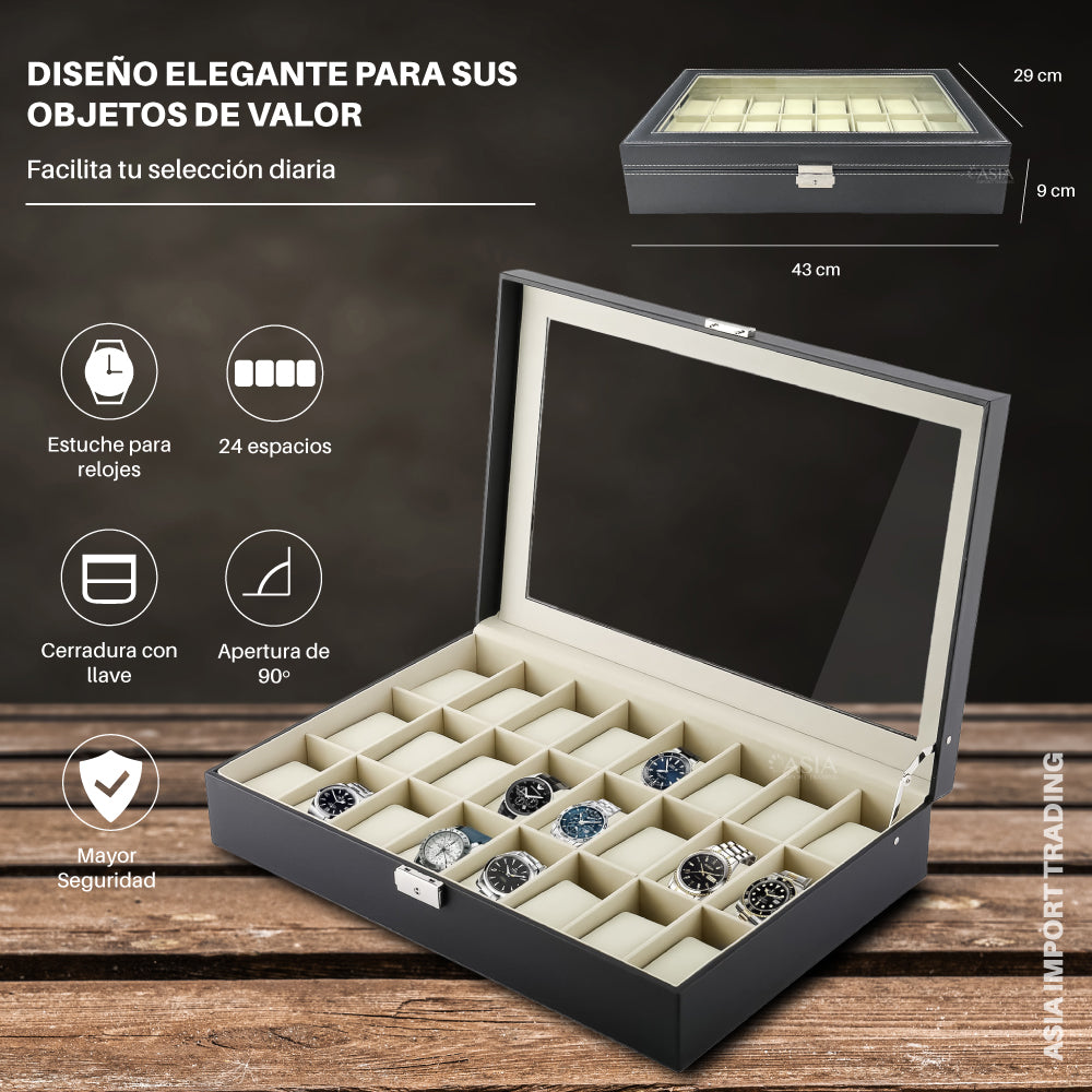 Gratamente sorprendido por la caja para 24 relojes que compre recientemente. Por el precio pagado esperaba algo no tan bonito y bien hecho. Las terminaciones son bastante buenas y se ve bonita. Cumple su objetivo y cuidandola durará bastante. La entrega fue rápida y cumplieron la fecha comprometida. Excelente