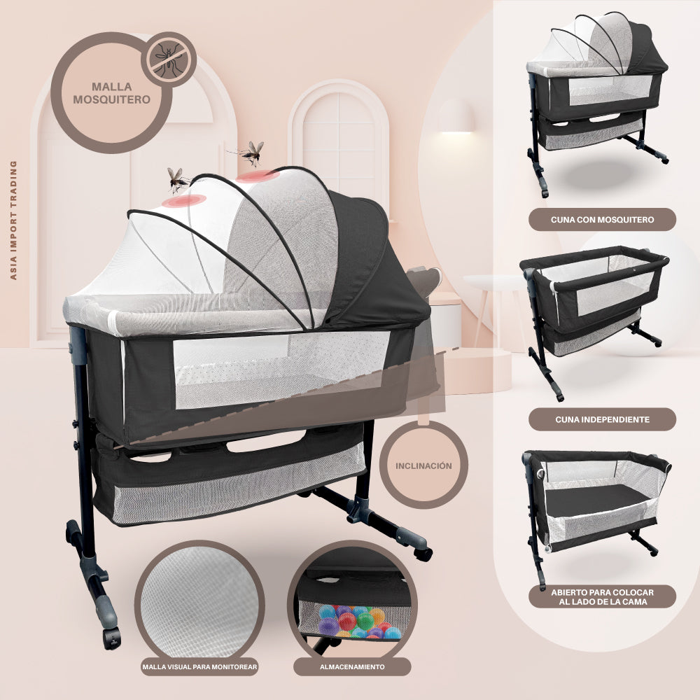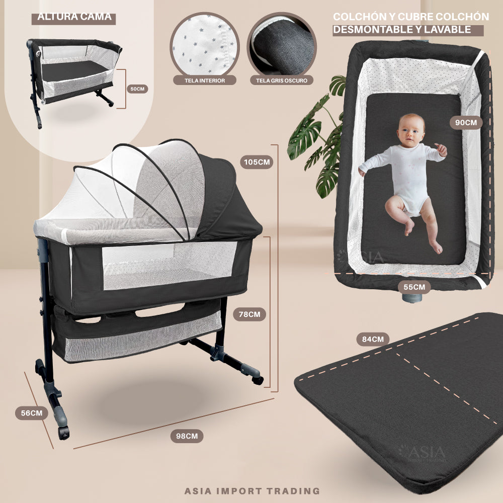 Duerme cerca de tu bebé con tranquilidad y seguridad con esta cuna colecho. Diseñada para adaptarse a la cama de los padres, facilita el cuidado nocturno y fomenta un vínculo cercano. Con una estructura estable y materiales suaves y transpirables, incluye un toldo para proteger al bebé de la luz y mosquiteros para mayor confort.