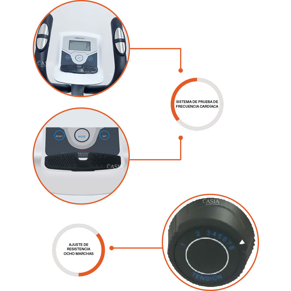 Ajuste de resistencia de 8 velocidades, el reloj electrónico puede mostrar la frecuencia cardíaca, el tiempo de ejercicio, la velocidad de movimiento, la distancia, el consumo de calor, etc.