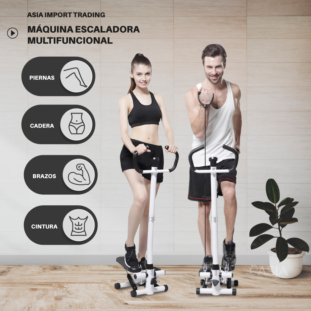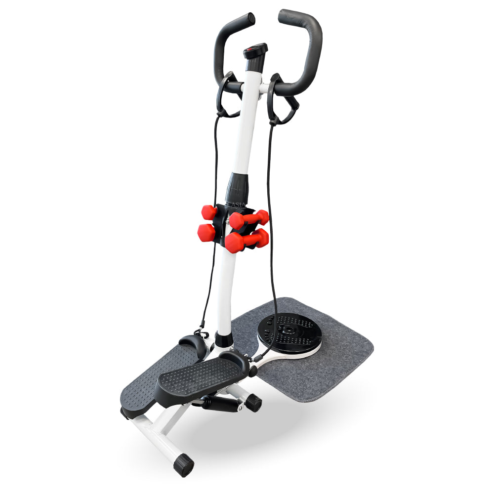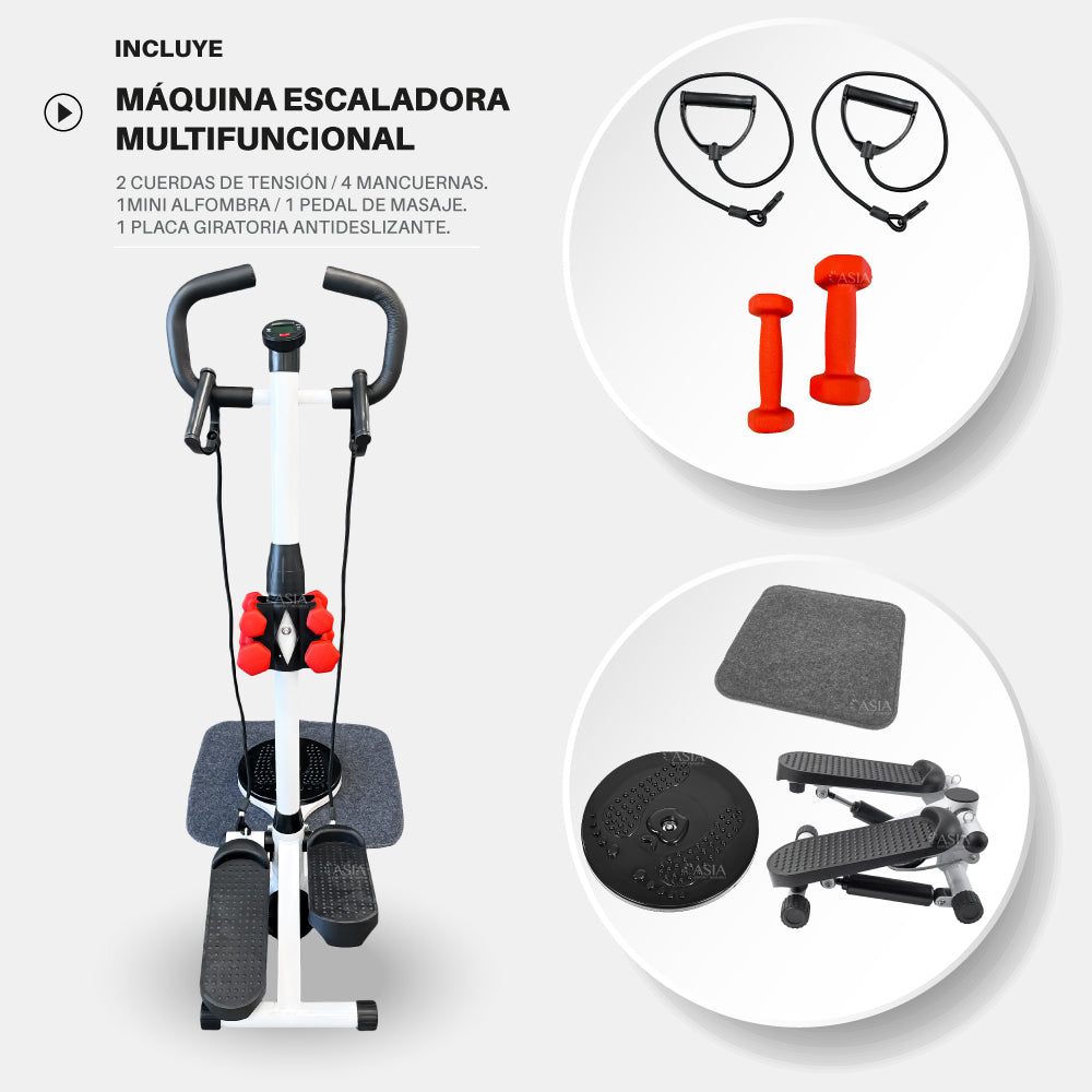 Máquina aeróbica escaladora cuenta con un par de mancuernas y mini disco (Twister) que permiten un entrenamiento multifuncional muy adecuado para entrenar piernas cintura caderas y músculos de los brazos.