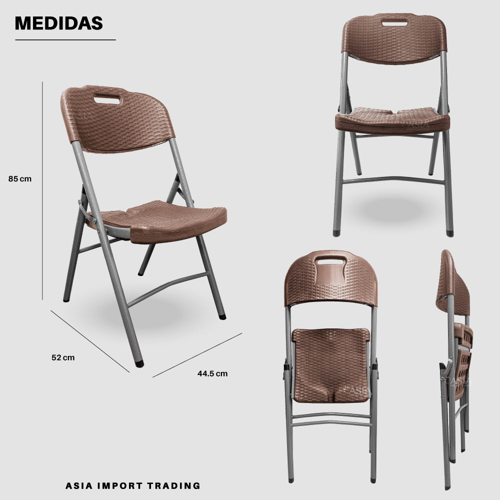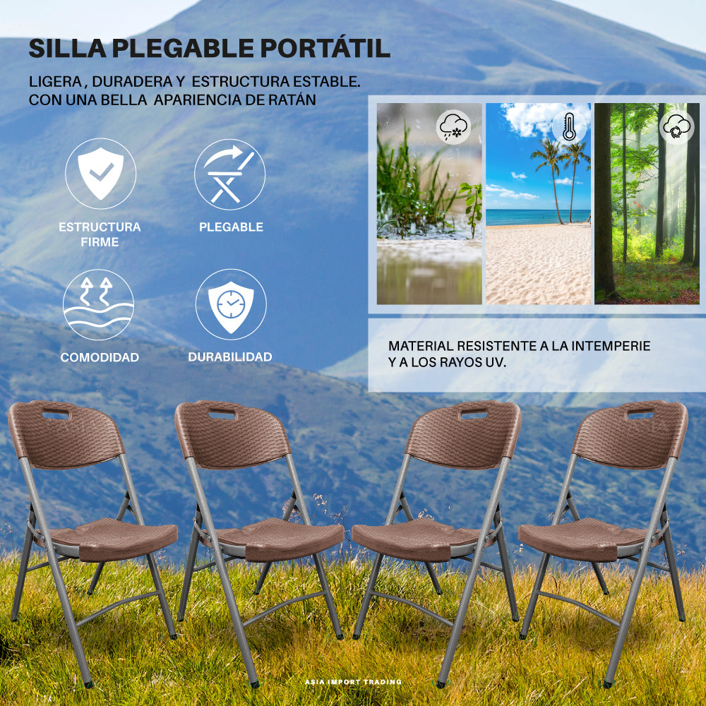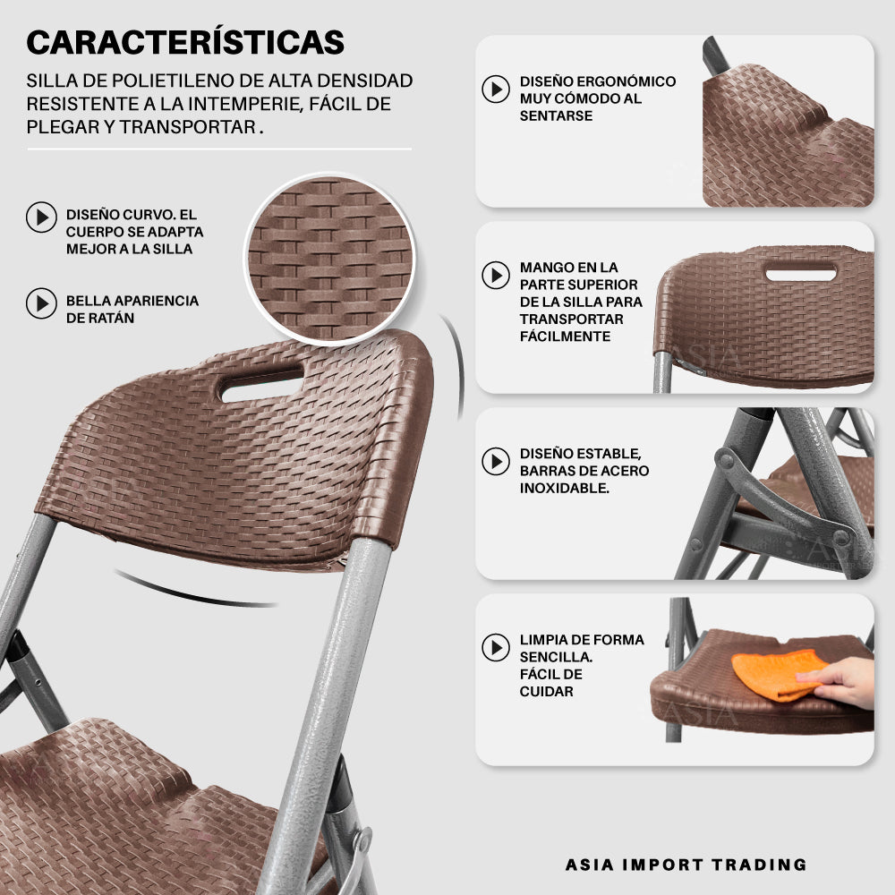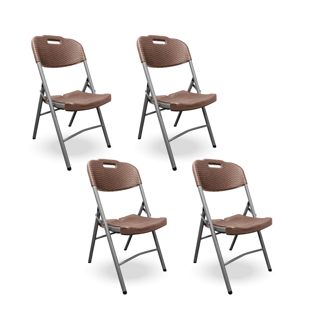 Pack de 4 Sillas Plegables estilo rattan en color café oscuro , son la alternativa ideal para tu terraza, jardín o eventos al aire libre. Su diseño plegable la hace ser muy practica al momento de almacenar o guardar. Esta silla además es Ideal para su uso en eventos ya que permite ponerle una funda y se puede almacenar utilizando menos espacio. Podrás recoger cómodamente las sillas ya que el respaldo posee un espacio / mango que permite tomarla fácilmente con una mano ya sea estando plegada o no. Sus patas de acero dan una gran resistencia, se puede usar tanto en exterior como en interior, además, su construcción en plástico resistente estilo rattan brinda gran comodidad y facilidad al momento de limpiar las superficies de asientos y respaldos