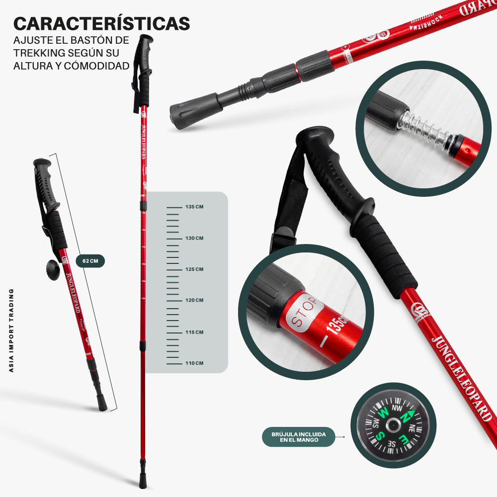 Pack de 2 Bastónes de Trekking livianos y de alta calidad con resorte antishock que reduce el impacto aliviando el peso corporal en rodillas y tobillos, es ajustable para distintas alturas, ideal para la práctica de senderismo o excursiones al aire libre. Es muy versátil, apto para excursionistas principiantes hasta más avanzados, niños, adultos, personas mayores.