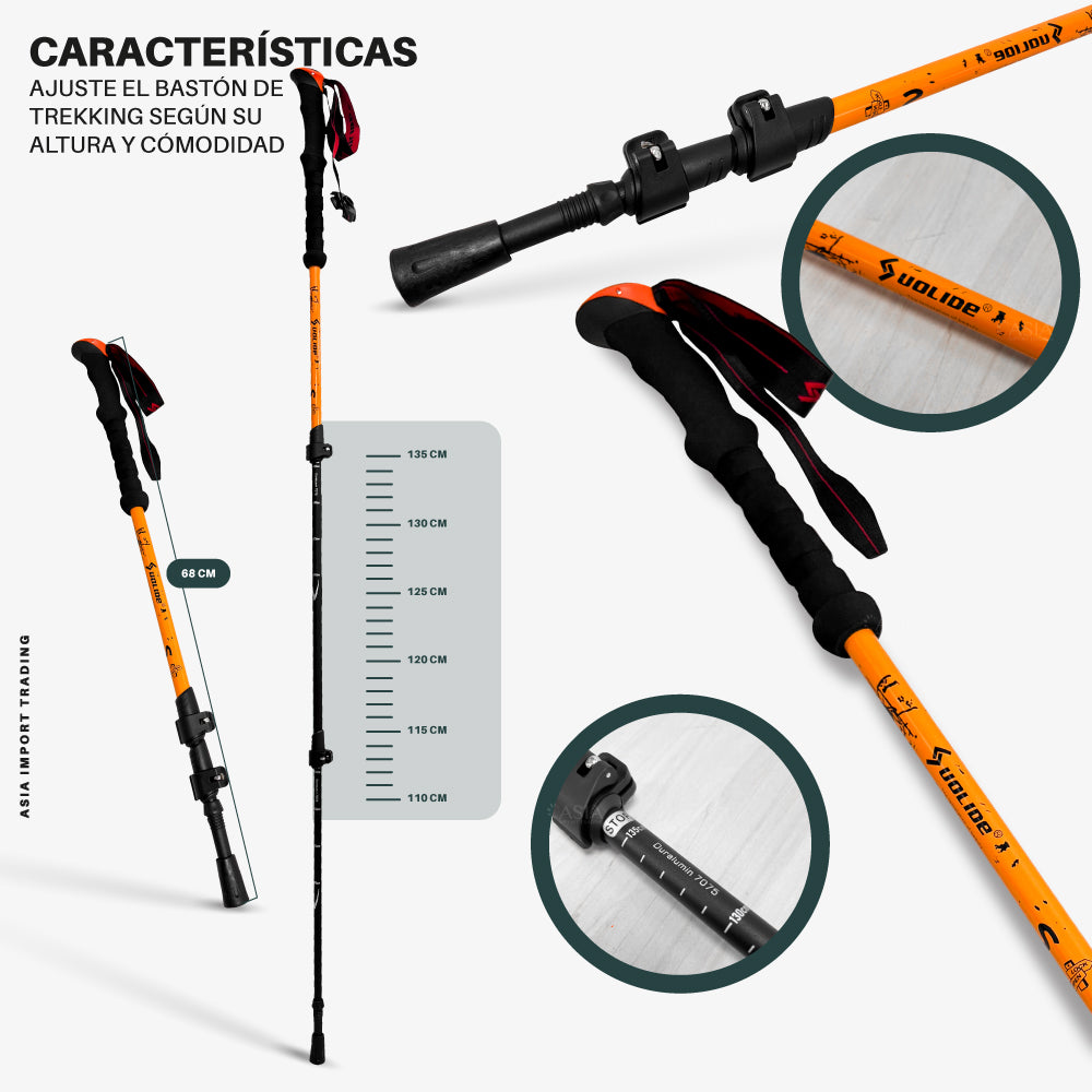 Pack de 2 Bastónes de Trekking livianos y de alta calidad con resorte antishock que reduce el impacto aliviando el peso corporal en rodillas y tobillos, es ajustable para distintas alturas, ideal para la práctica de senderismo o excursiones al aire libre. Es muy versátil, apto para excursionistas principiantes hasta más avanzados, niños, adultos, personas mayores. Expansible en 3 secciones va desde los 63cm hasta un largo total de 135 cm Sistema fácil de ajuste tipo torcedura para adaptar a la altura que te quede mas cómodo. Mango ergonómico antideslizante con absorción de sudor y cinta para la muñeca ajustable, además cuenta con una brújula en su pare superior para que nunca pierdas la ruta. Punta de acero con soporte base de goma para mejor protección, accesorio roseta para superficies blandas como arena o nieve.
