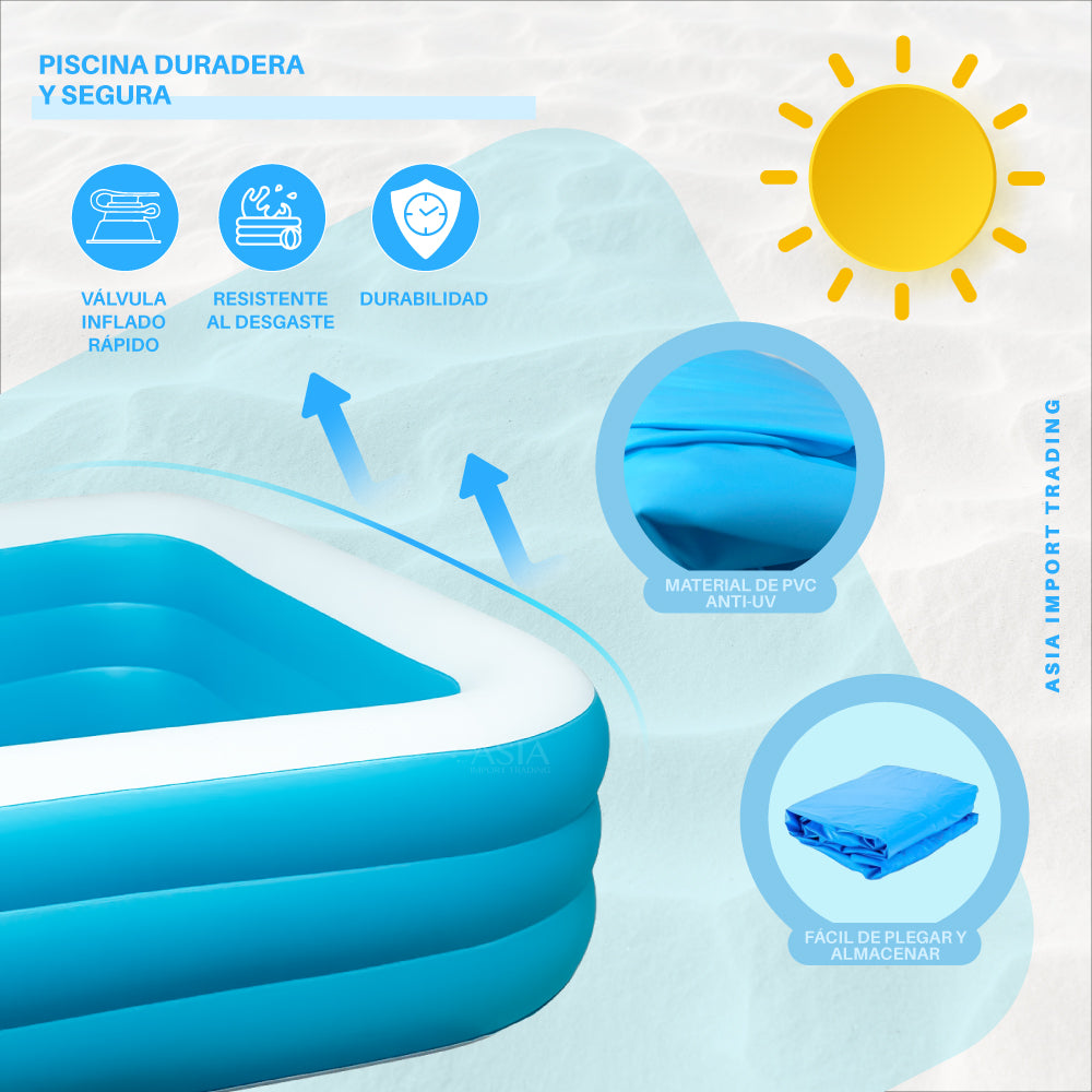 Esta excelente piscina inflable es ideal para esos días calurosos donde los niños y toda la familia pueden disfrutan al máximo, muy práctica, y de fácil guardado, con sus cámaras de aire independiente brinda un armado firme y duradero