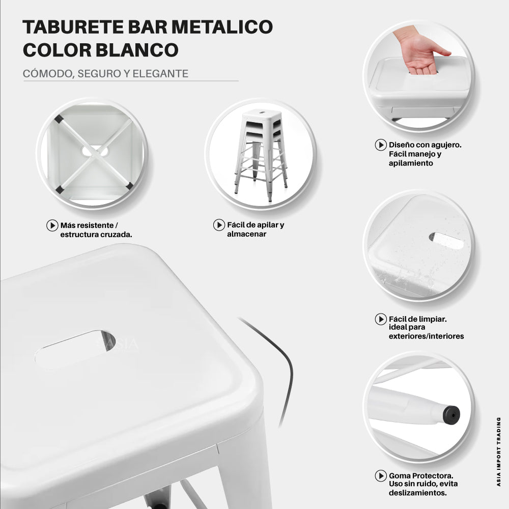 Construido en metal es resistente y liviano, puede ser usado tanto en interior como en exteriores, posee una barra reposa pies y en su asiento tiene una apertura para tomarlo con gran facilidad.