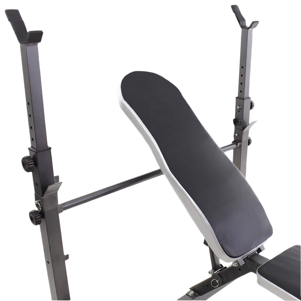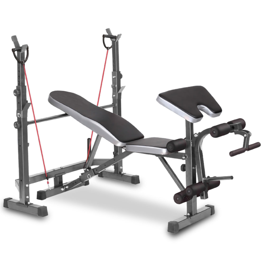 Banca Multifuncional ajustable con soporte para pesas y extensión de piernas para un entrenamiento de cuerpo completo.