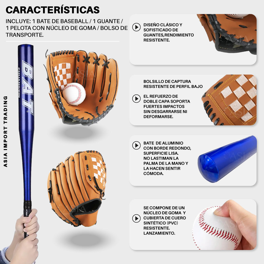 El Bate de Aluminio es de borde redondo y superficie lisa, muy liviano lo que permite su manejo fácilmente, su longitud de 30” (76cm) te permitirá realizar golpes con fuerza y precisión, el Guante de 12,5” es de tamaño perfecto para jóvenes y adultos.