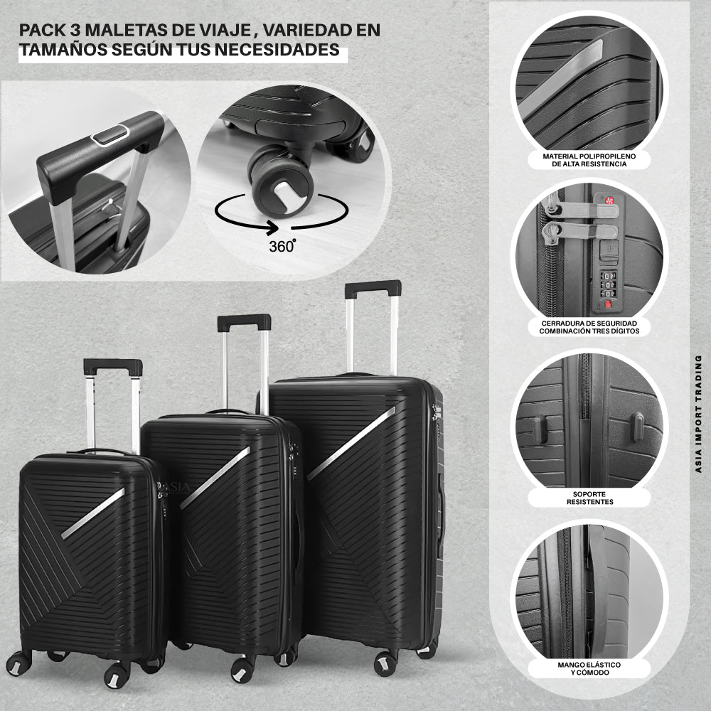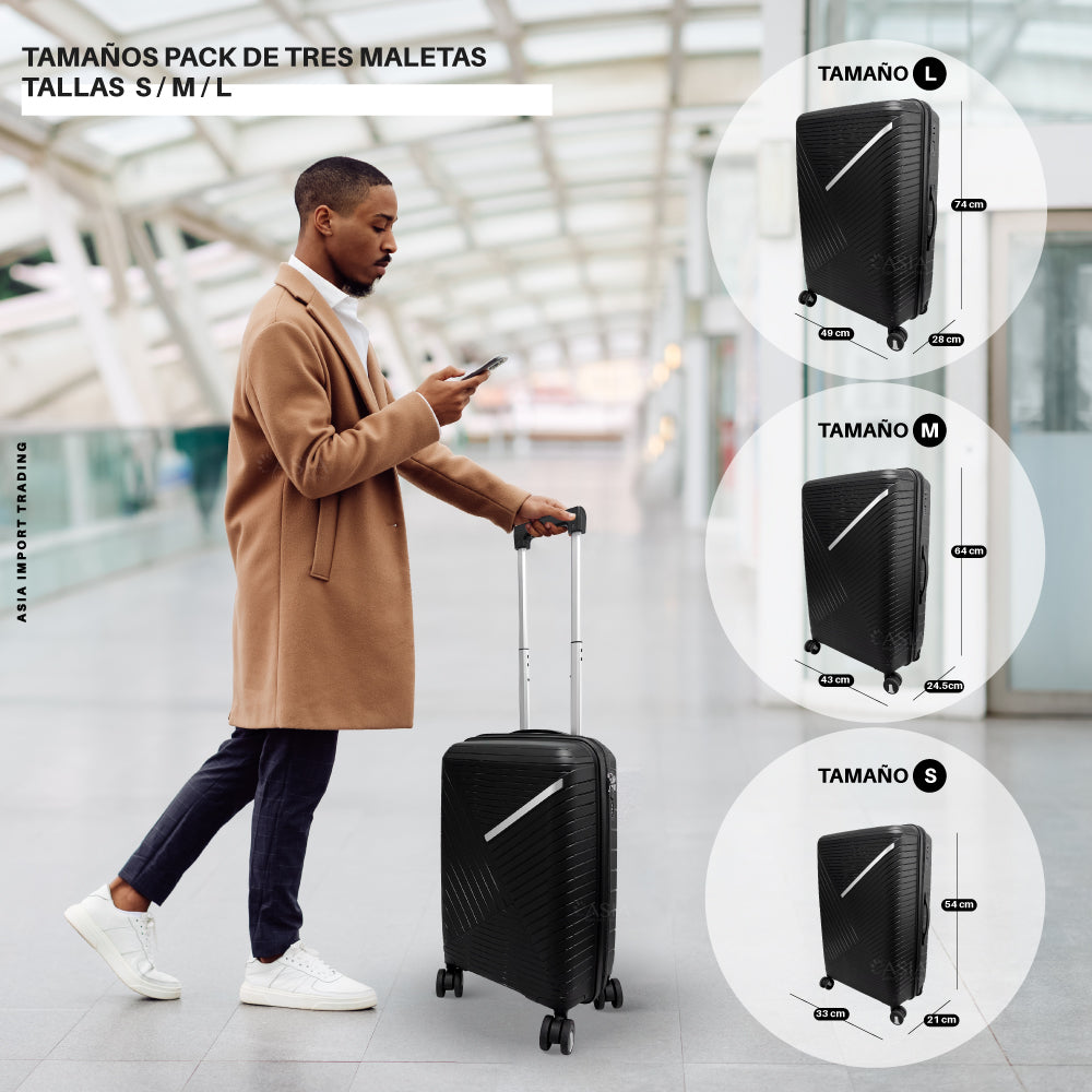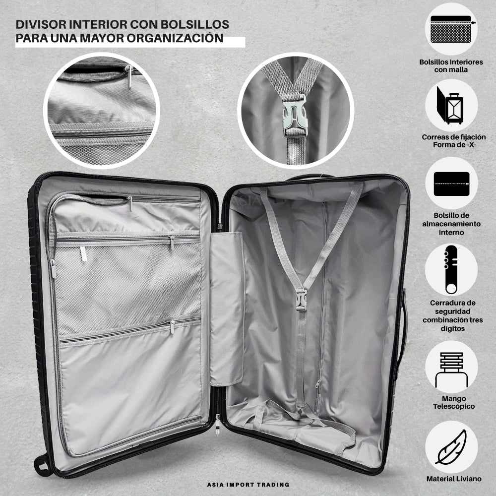 Set de 3 maletas de viaje en diferentes tamaños, Equipajes Ultraligeros hechos en material rígido resistente y con un diseño moderno y elegante.