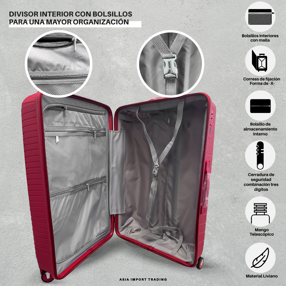 Cada maleta cuenta con 4 ruedas que giran en 360°, otorgando un suave y silencioso andar en toda superficie.