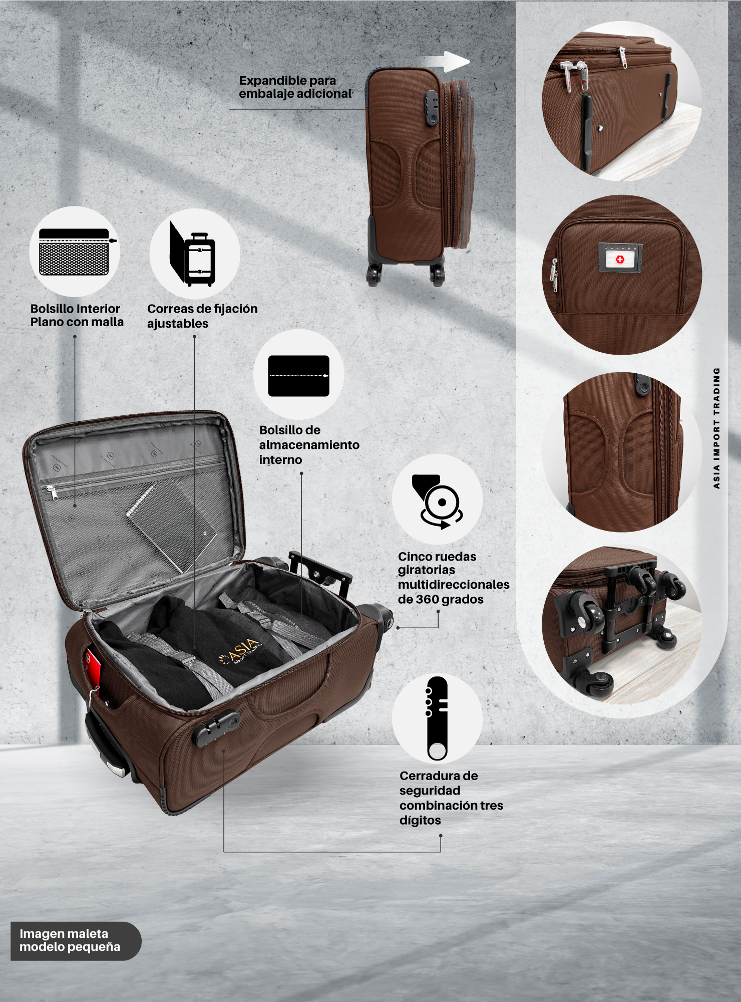 Su interior es de gran espacio, con compartimientos separados, posee correa para afirmar la ropa y bolsillos de organización con cierre, para separar documentos u objetos pequeños.