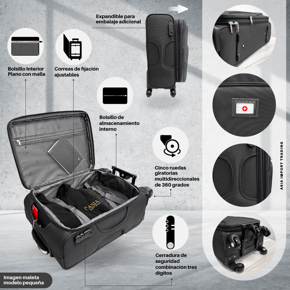 Cada maleta cuenta con 5 ruedas que giran en 360°, la quinta rueda puede extenderse para brindar una mayor superficie de apoyo a la maleta lo que entrega gran estabilidad y un suave desplazamiento.