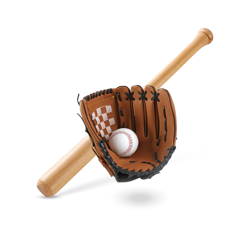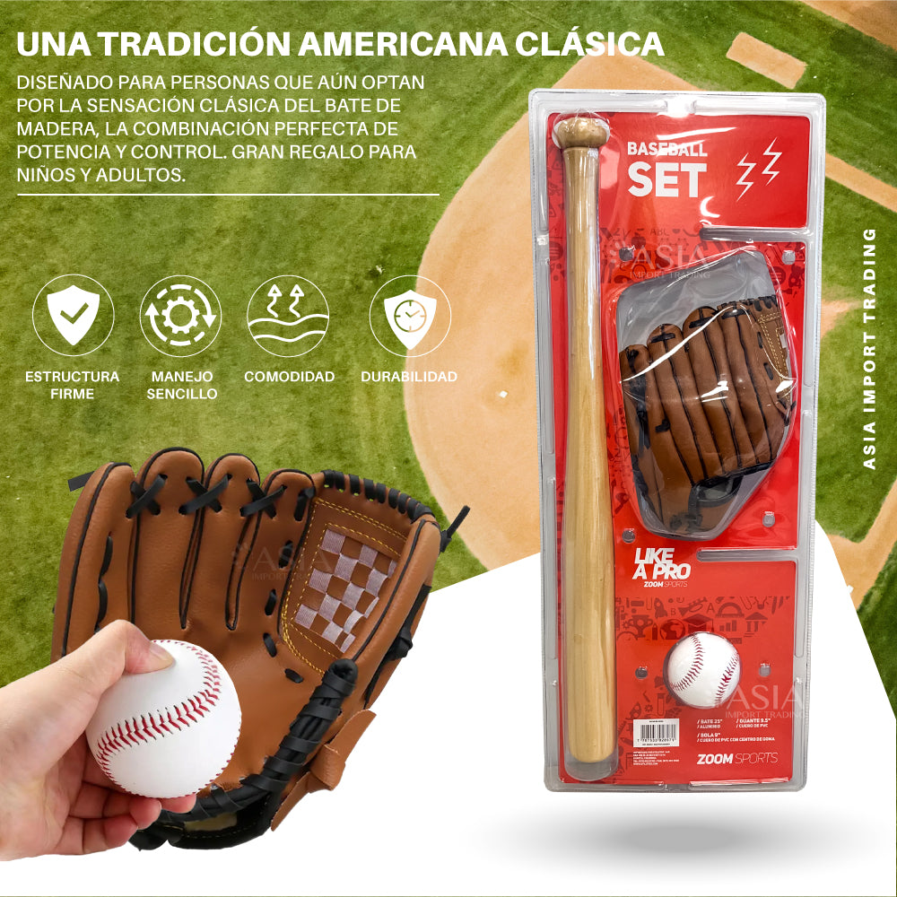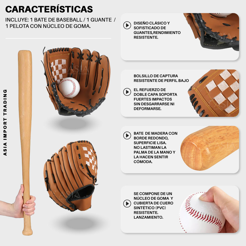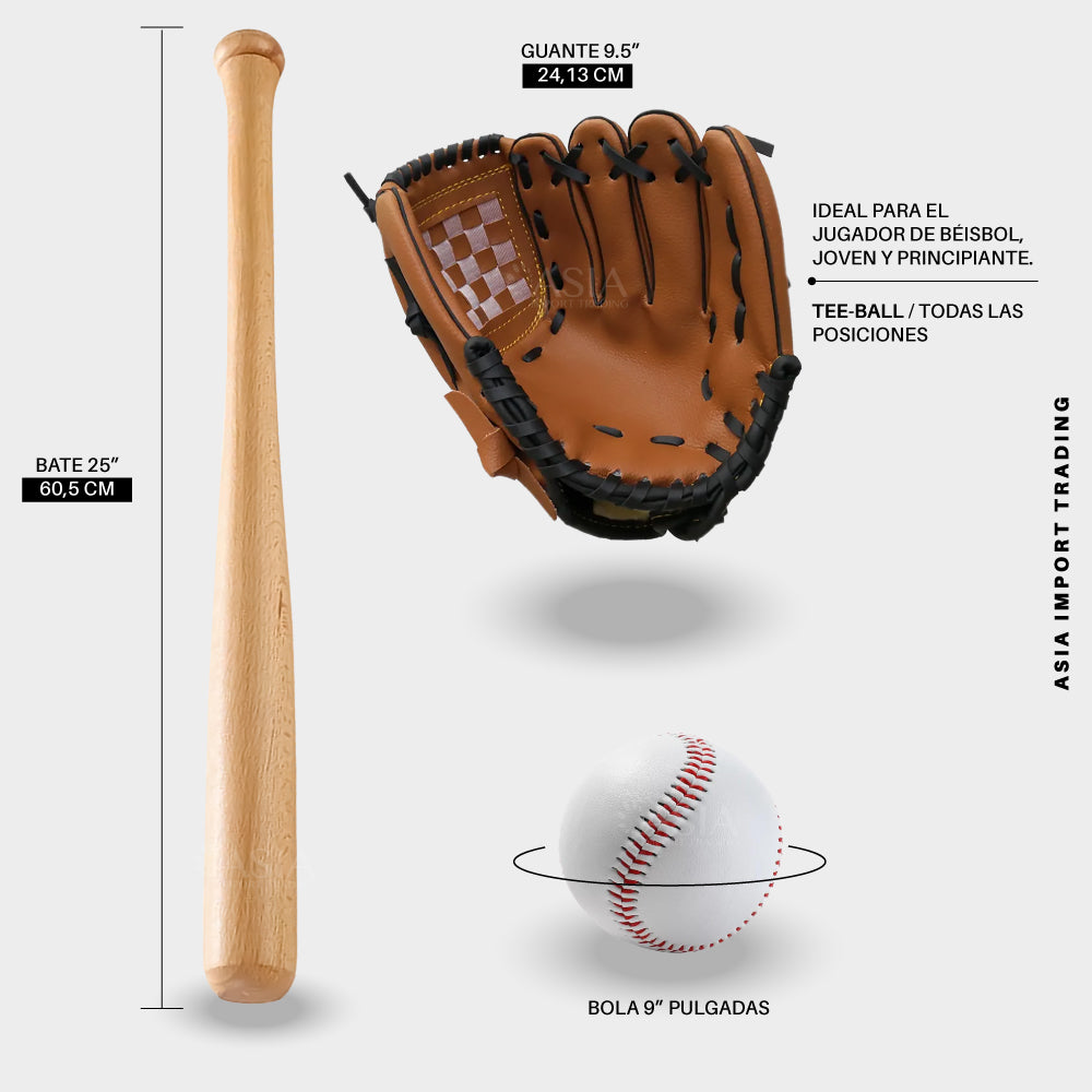 El Bate de madera de 25” (60cm) permite realizar golpes potentes y con precisión, Guante de inicio 9,5” y pelota 9