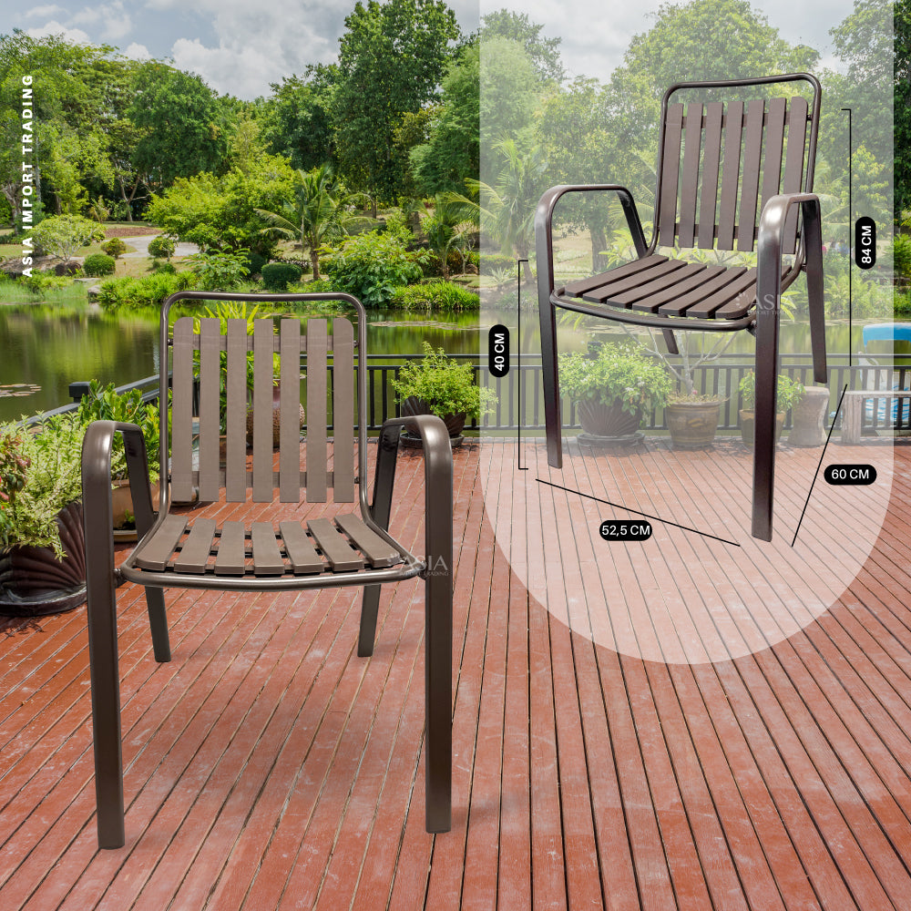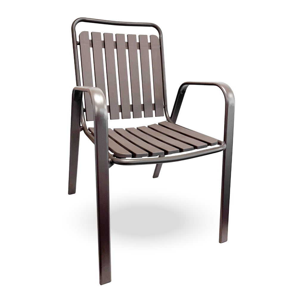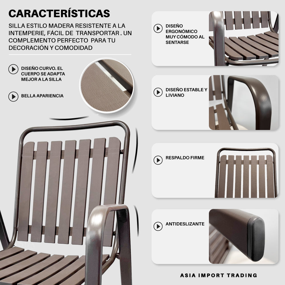 Esta Silla de terraza es comoda y firme, ideal para disfrutar de un descanso en tu jardin o espacios abiertos, su diseño con apoya brazos brinda gran comodidad y su respaldo ademas de estar hecho con unos comodos listones de apoyo estilo madera tiene una leve inclinación lo que entrega una placida postura a la zona de la espalda que te dara un grato descanso