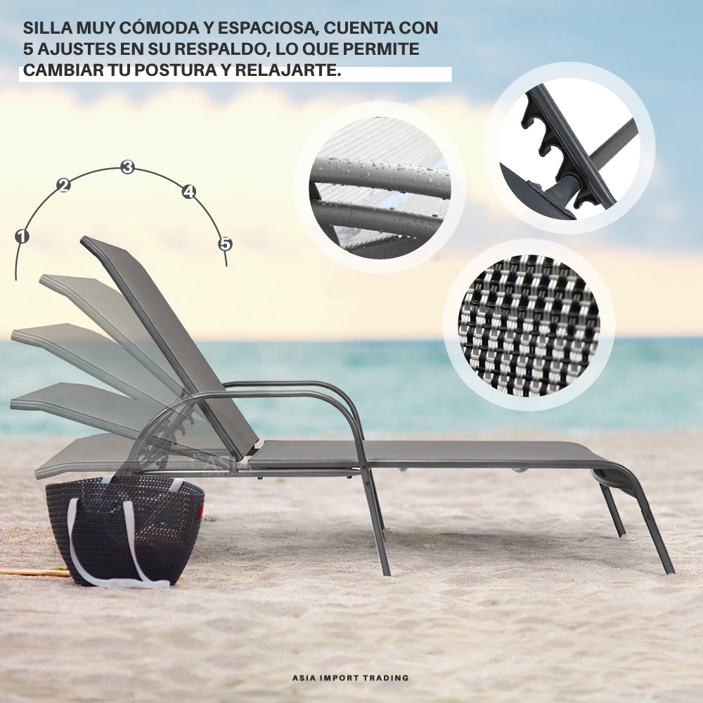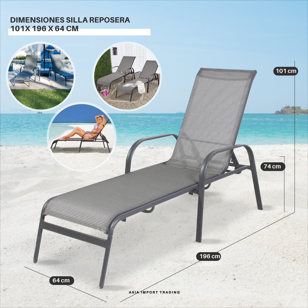 Reposera ideal para ser instalada en el área de la piscina o terraza para un placido descanso, cuenta con respaldo reclinable en 5 posiciones y prácticos apoyabrazos para una posición más cómoda.