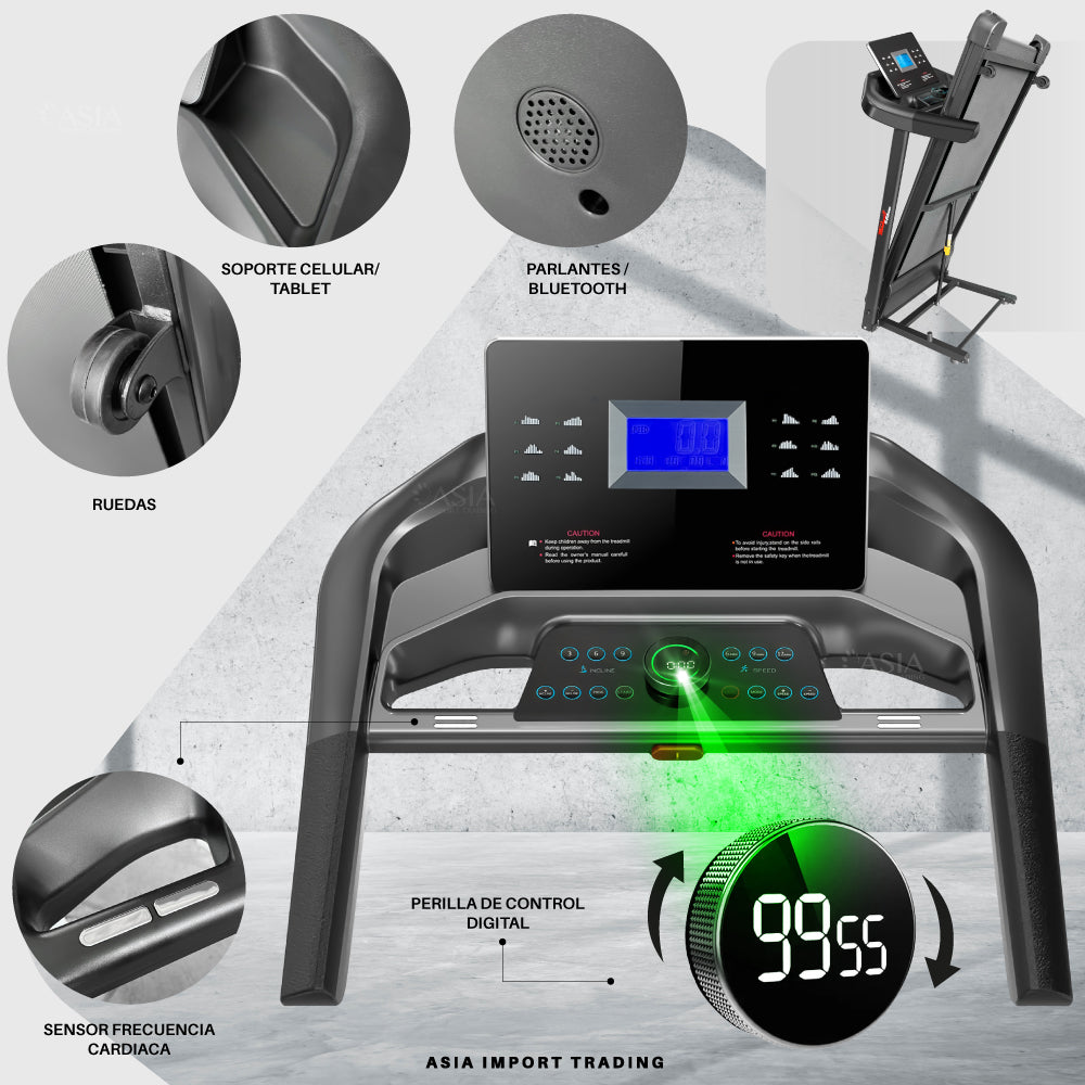 La pantalla LCD te ofrece la visualización de todos los parámetros, Velocidad, distancia, tiempo y calorías quemadas, además tiene parlantes incorporados los que via bluetooth se conectan a tu teléfono o Tablet para disfrutar de tu música favorita mientras te ejercitas, Cuenta con soporte para iPad / celular, hace que el entrenamiento sea más entretenido y fácil, 2 posavasos que le permiten reponer agua a tiempo mientras usa la máquina trotadora