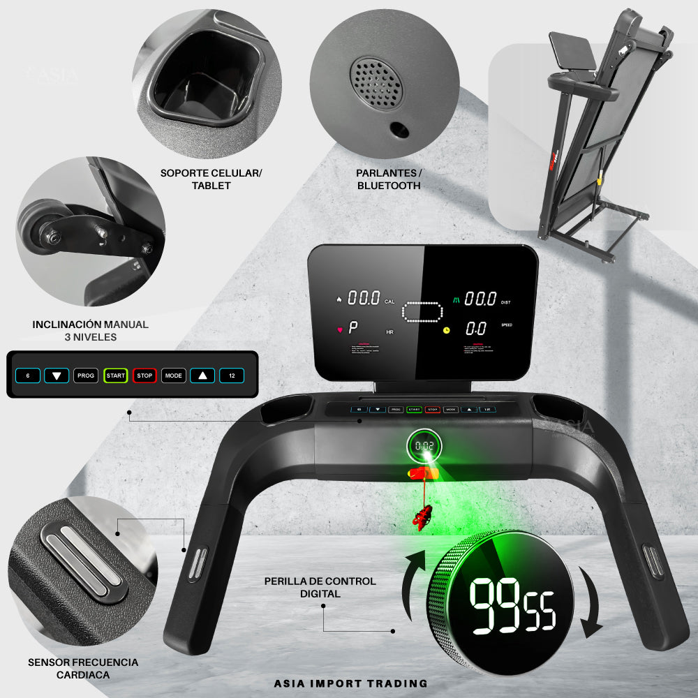 La pantalla LCD te ofrece la visualización de todas la variables de tu rutina, velocidad, distancia, tiempo, calorías quemadas, tiene parlantes incorporados los que via bluetooth se conectan a tu teléfono o Tablet para disfrutar de tu música favorita mientras te ejercitas, cuenta con soporte para iPad / celular, hace que el entrenamiento sea más entretenido y fácil, 2 posavasos que le permiten reponer agua a tiempo mientras usa la máquina trotadora